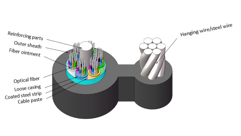Produktbeschreibung: Die Struktur des Lichtwellenleiters besteht darin, Singlemode- oder Multimode-Glasfasern in ein loses Rohr aus hochmodularem Kunststoff einzufügen, das mit wasserfestem Verbundstoff gefüllt ist. Der Mittelpunkt des Kabelkerns ist ein metallverstärkendes Bauteil. Bei einigen Lichtwellenleitern mit bestimmten Kernzahlen besteht die Struktur des Lichtwellenleiters darin, Singlemode- oder Multimode-Glasfasern in ein loses Rohr einzufügen, das mit wasserfestem Verbundstoff gefüllt ist. Eine Polyethylen-Dämpfungsschicht wird extrudiert und um den metallischen zentralen Verstärkungsteil gewickelt. Lose Rohre (und Füllseile) werden um den zentralen Verstärkungsteil gewickelt, um einen kompakten und runden Kabelkern zu bilden. Die Lücken im Kabelkern werden mit wasserblockierendem Verbundstoff gefüllt. Eine Stahl-Polyethylen-Verbundhülle wird extrudiert und außen herum gewickelt, und gleichzeitig werden Stahlseilaufhänger installiert, um das Kabel zu bilden.
