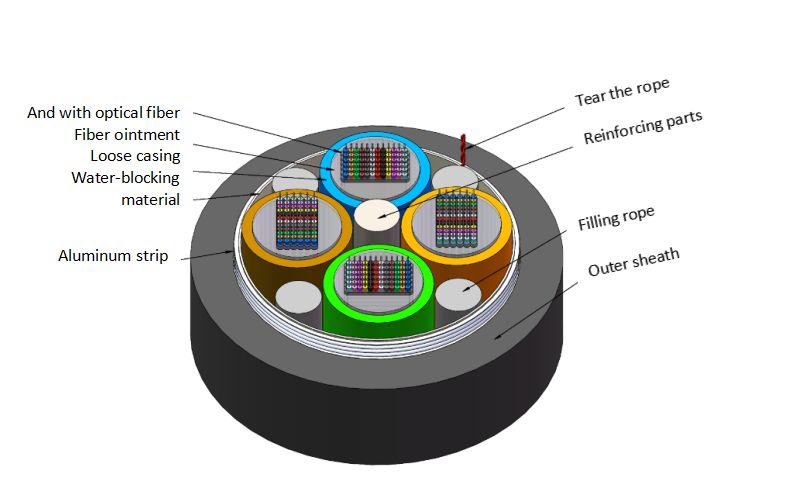 Die Struktur des optischen Kabels besteht darin, ein Mode- oder Multi-Mode-Glasfaserklebeband in ein lockeres Rohr aus Kunststoff mit hohem Modul zu setzen und mit einer wasserdichten Verbindung gefüllt zu werden. Die Mitte des Kabelkerns ist ein metallverstärkender Teil. Für einige optische Kabel mit bestimmten Kernzahlen ist eine Polyethylenpolsterschicht außerhalb des zentralen Verstärkungsteils aus Metall extrudiert. Lose Röhrchen (und Füllseile) werden um das zentrale Verstärkungselement verdreht, um einen kompakten und runden Kabelkern zu bilden. Die Lücken innerhalb des Kabelkerns werden mit wasserblockierender Verbindung gefüllt, und eine Aluminium-Polyethylen-Hülle wird nach außen extrudiert, um das Kabel zu bilden.