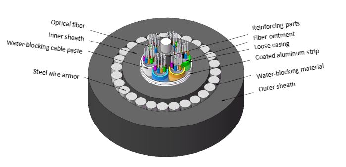 Die Struktur des optischen Kabels besteht darin, einmodische oder mehrmodische optische Fasern in ein loses Rohr zu stecken, das mit einer wasserdichten Verbindung aus hochmodularem Kunststoff gefüllt ist.In der Mitte des Kabelkerns befindet sich eine MetallverstärkungskomponenteEs umfaßt Metallverstärkungsbauteile, losfeste Schicht-Strahlfüllung, Aluminium-Polyethylen-verbundene Innenhülle, feine runde Stahldraht-Rüstung,mit einem Gehäuse aus PolyethylenBei einigen Kernzahlen von optischen Kabeln wird eine Polyethilenpolsterung um das Metall-Zentralverstärkungselement herum extrudiert.Loser Rohre (und Füllseile) werden um das zentrale Verstärkungselement verdreht, um einen kompakten und runden Kabelkern zu bildenDie Lücken im Kabelkern werden mit einer wasserdichten Verbindung gefüllt, und eine Aluminium-Polyethylen-gebundene Innenhülle wird extrudiert.Die Lücken werden mit einer wasserdichten Verbindung gefüllt., und dann wird die Polyethylenhülle extrudiert, um das Kabel zu bilden.