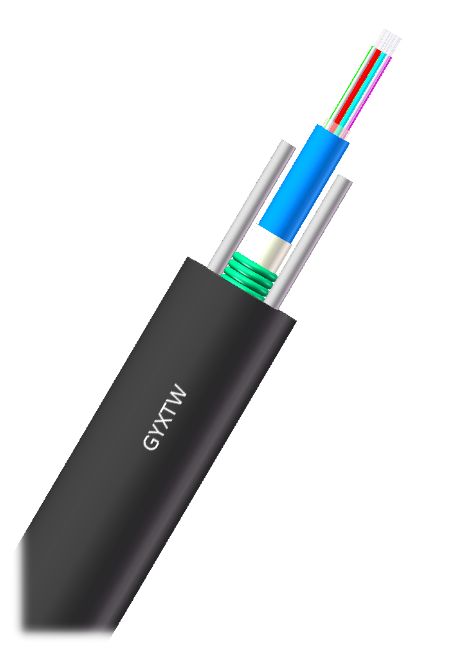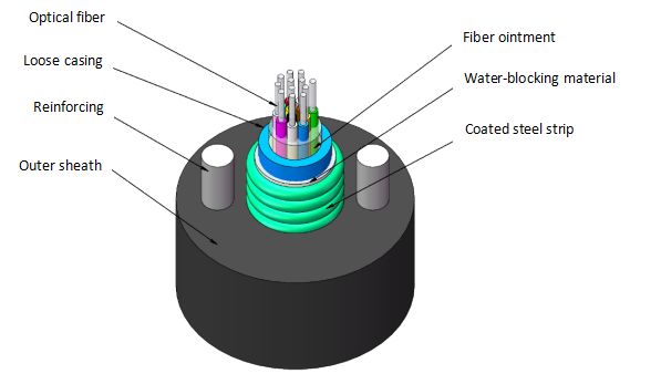 Die Struktur des Lichtwellenleiters besteht darin, Singlemode- oder Multimode-Glasfasern in ein loses Rohr aus hochmoduligem Kunststoff einzuführen, das mit wasserfestem Verbundstoff gefüllt ist, und es in der Mitte des Kabels zu platzieren. Wasserblockierende Materialien werden zwischen der Außenseite des Rohrs und dem Stahlband platziert. Zwei parallele Stahldrähte sind als Verstärkungsträger in die Ummantelung eingebettet, und die Außenseite wird extrudiert und mit einer Polyethylen-Verbundummantelung umwickelt, um das Kabel zu bilden.